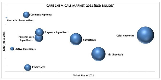 The report "Top 10 Care Chemicals Market (Color Cosmetics, Personal Care Ingredients, Active Ingredients, Fragrance Ingredients, I&I Cleaning Chemicals, Surfactants, Emollient Esters, Cosmetic Pigments, Cosmetic Preservatives, Ethoxylates) - Global Forecast to 2021", Care chemicals are products that are used for homecare, personal care and industrial and institutional cleaning. These chemicals, such as cosmetic products, cosmetic pigments, personal care ingredients, surfactants, and much more are used for skin care, hair care, cleanliness, and hygiene at home and workplace. The various markets covered in this report are color cosmetics, personal care ingredients, cosmetic pigments, active ingredients for cosmetics and surfactants market.